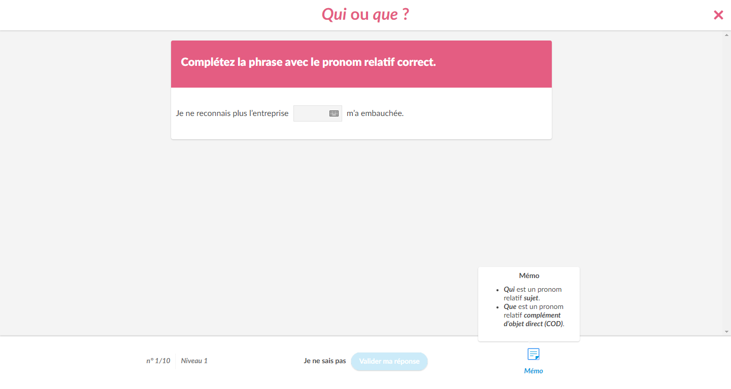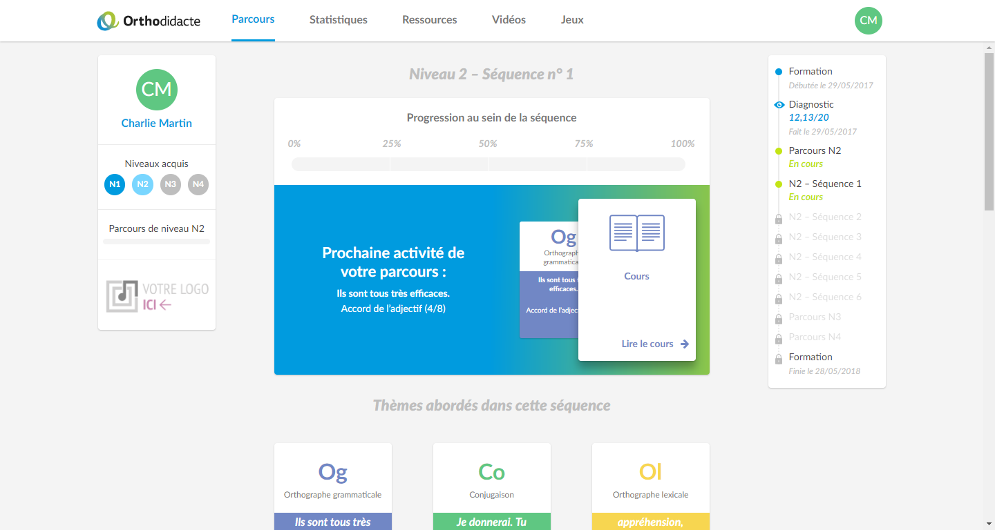 Orthodidacte vous propose une formation 100 % en ligne vous permettant d’améliorer vos écrits en langue française. Après un test de positionnement de 140 questions, vous aurez accès à un parcours personnalisé vous permettant de progresser.
